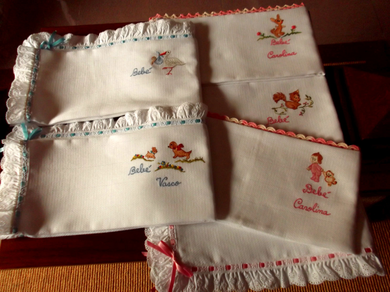 Fraldas de passeio com motivos bordados.