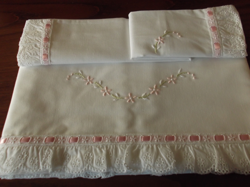 1 jogo de lençóis de berço 1.20mt x 1.60mt ( 2 lençóis e 1 almofada) 100% algodão com bordado inglês e passa-fitas rosa na bainha e com flores bordadas no tom rosa.