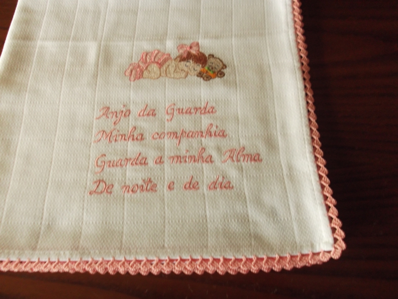 Fralda com acabamento em crochet e bordado em tom rosa.
