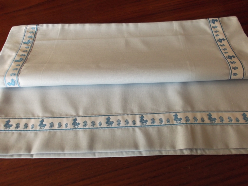 1 jogo de lençóis de berço 1.20mt x 1.60mt ( 2 lençóis e 1 almofada) 100% algodão cor azul com fitinha de fantasia com patinhos azuis.